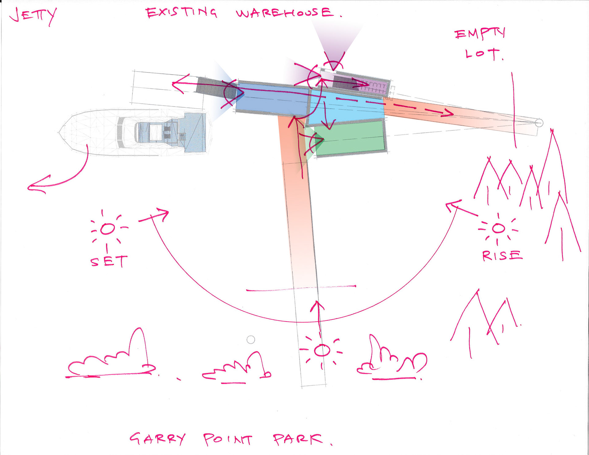 The Galley views intersect with the dock entry to establish a private eating space with close relationships with the existing heritage boatworks building and South empty lot.