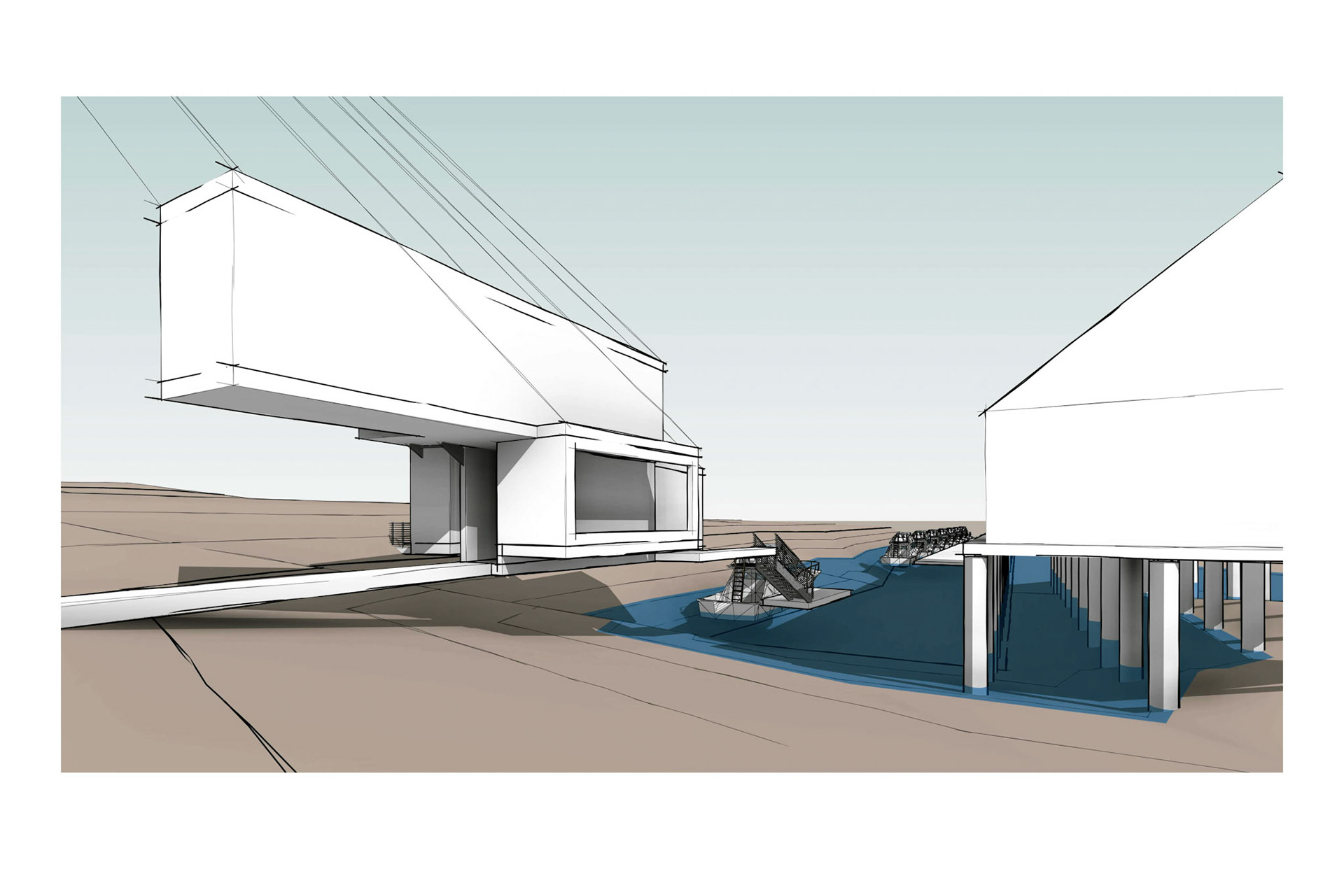 Tension is created in the separation of these planes, but also clearly demonstrates two axes at grade (horizontal beam and curved with shore).